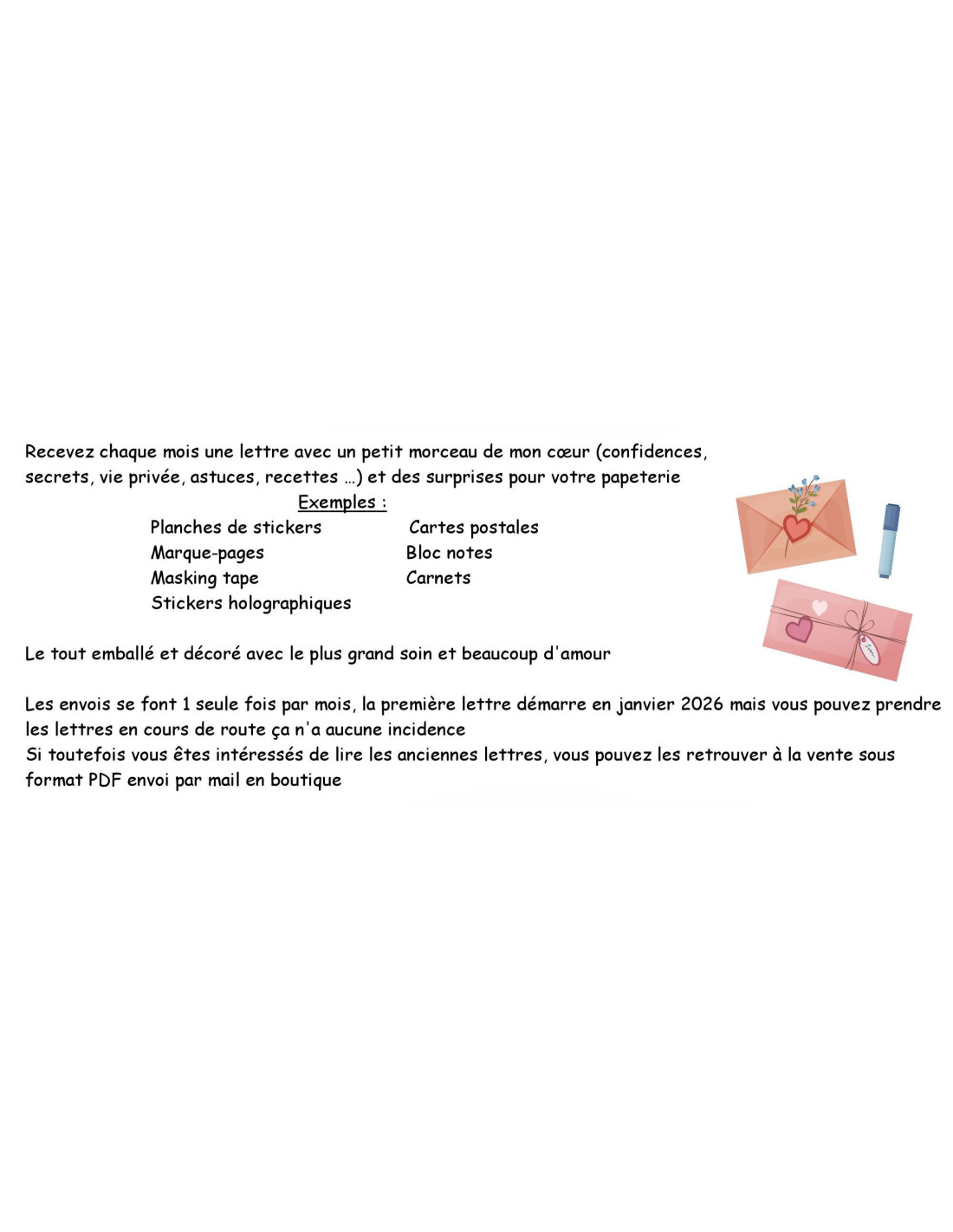 Une lettre personnelle, des conseils et idées, de la papeterie, des recettes, des photos, des accessoires ... le tout dans un envoi trés soigné et assorti qui change tous les mois