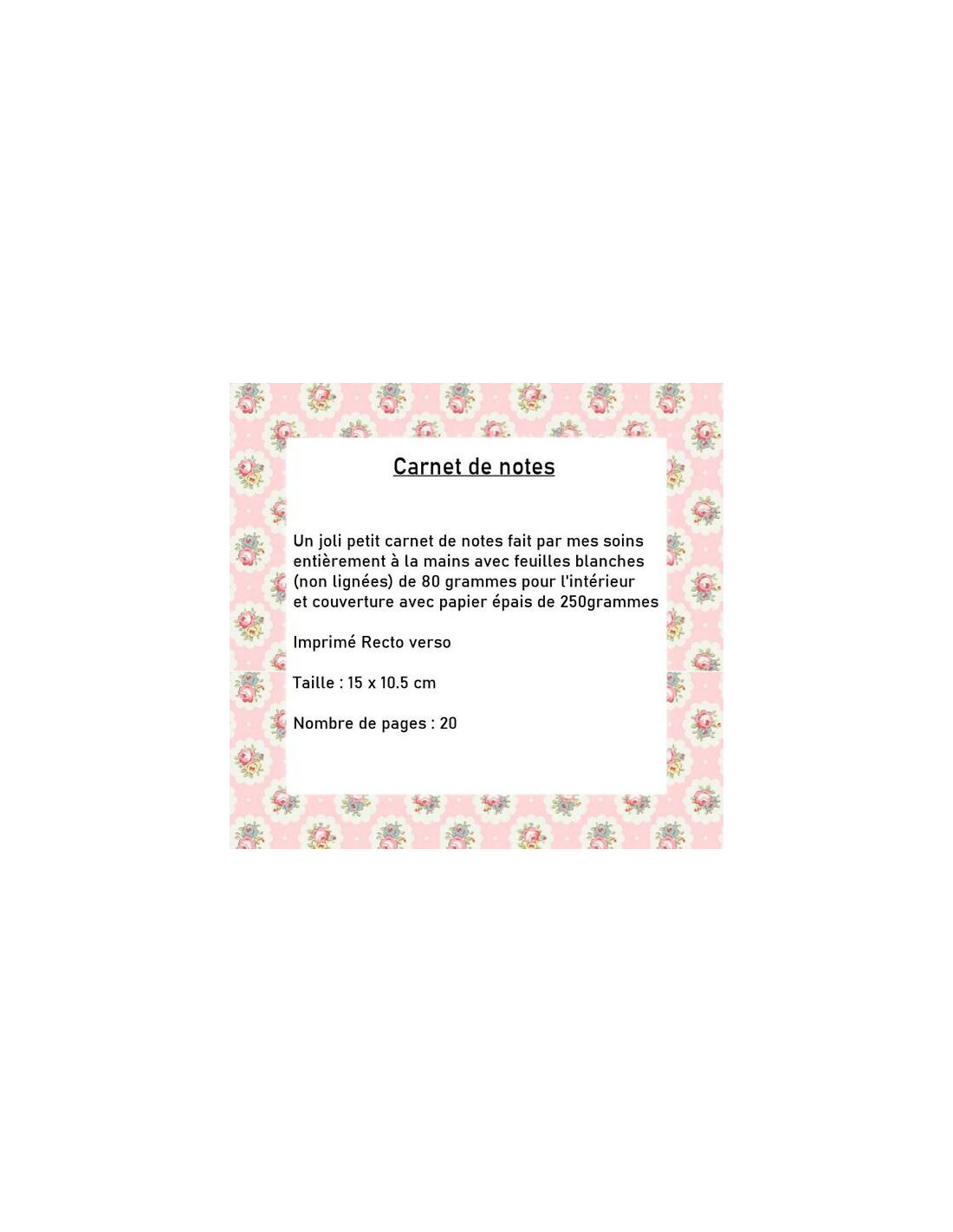 Un joli petit carnet de notes fait par mes soins entièrement à la mains avec feuilles blanches (non lignées) de 80grammes pour l'intérieur et couverture avec papier épais de 250grammes